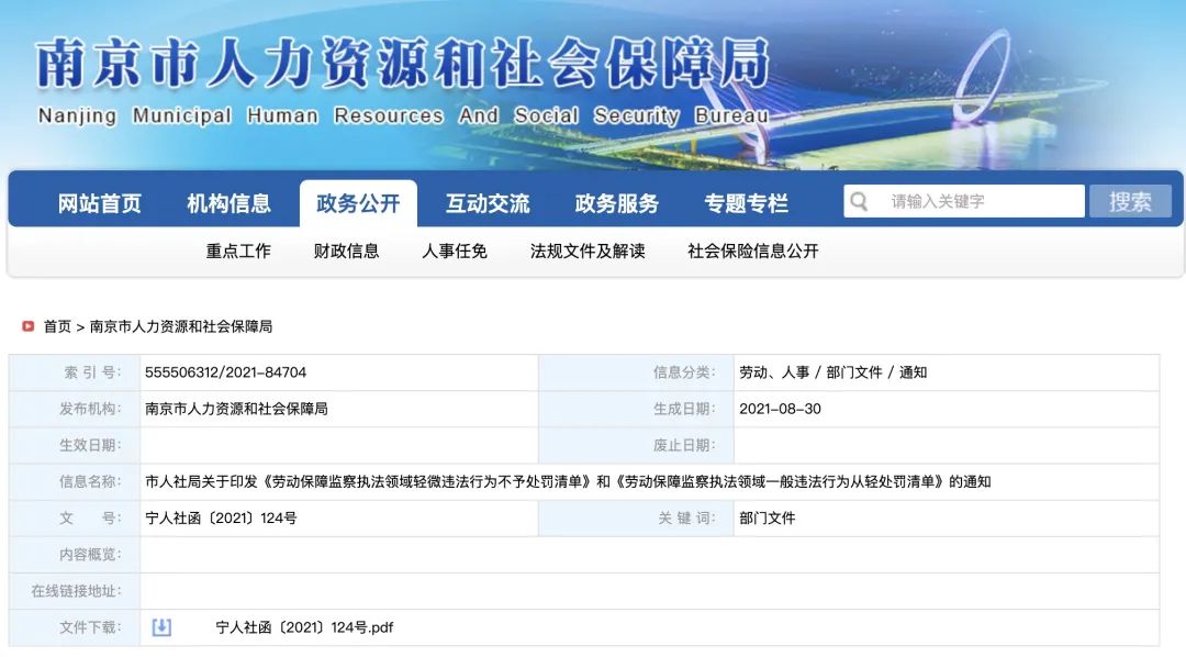 3、南京:7类劳动监察领域轻微违法行为不予处罚